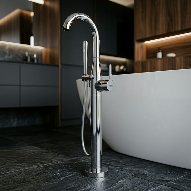 Смеситель однорычажный для ванны, GROHE Essence, напольный монтаж, хром (23491001). Изделие: смеситель, Цвет: хром, Страна: Германия, Высота см: 88.4, Форма: округлая.